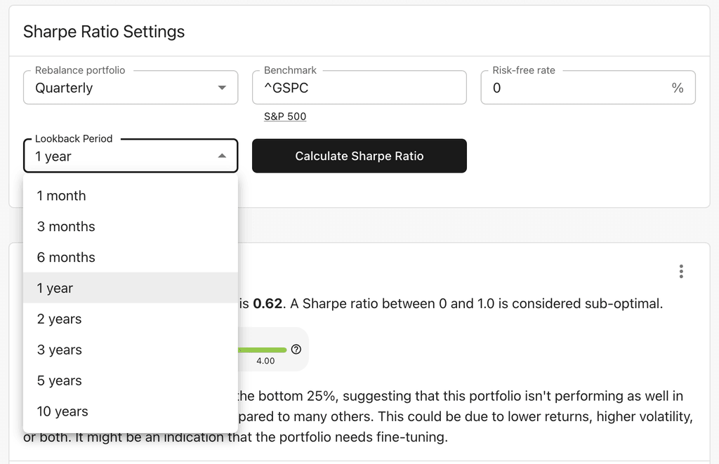 Yes, it's totally possible to calculate the Sharpe ratio and other metrics over extended periods, such as 1, 2, 5, or 10 years. This is available to all Pro subscribers. You can open the Sharpe ratio calculator and select the lookback period that suits your needs.
